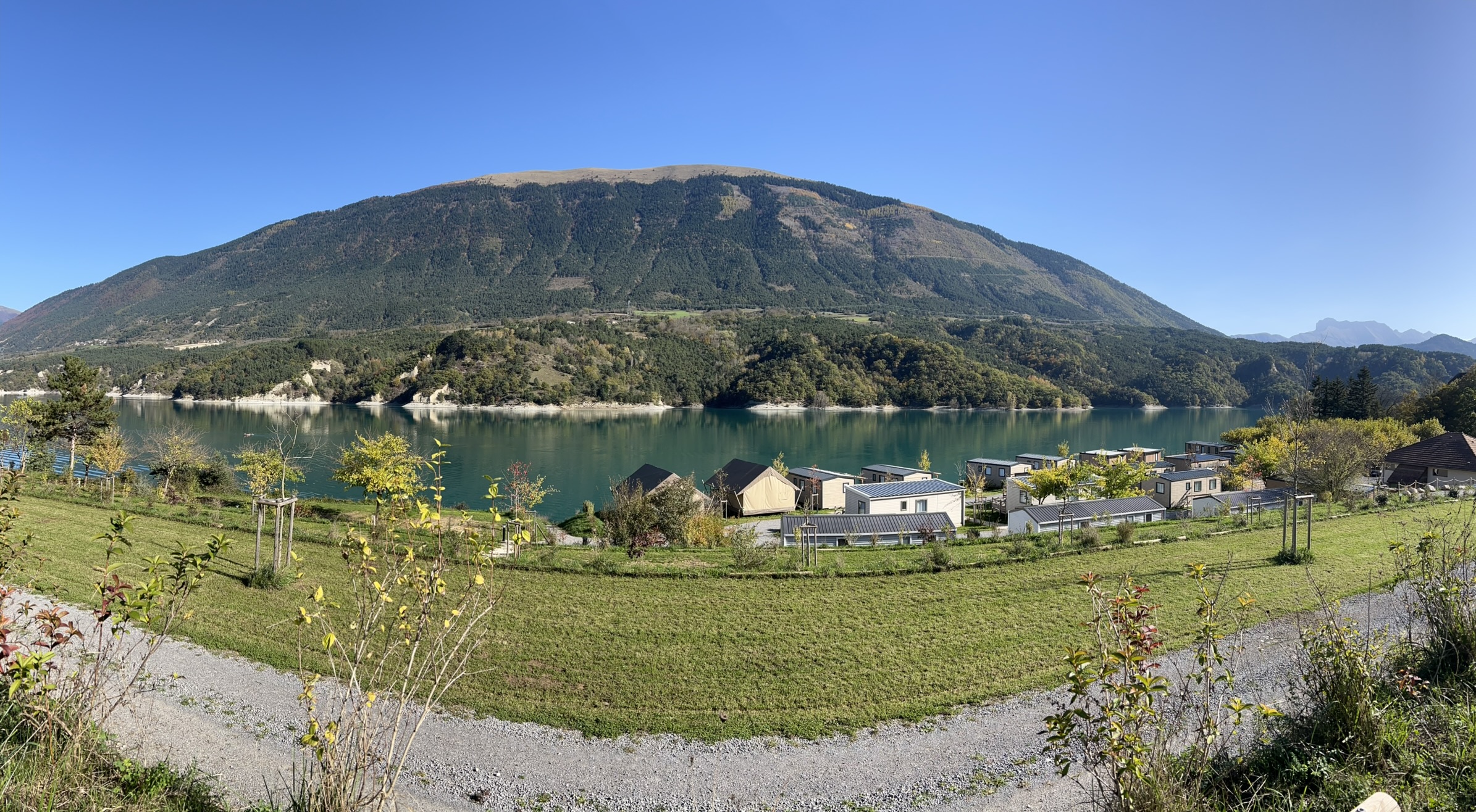 Genesteld in het hart van het meer, met zijn voeten in het water en op een steenworp afstand van de Ebron Himalayan loopbrug, kijkt de camping uit op de opkomende zon en heeft een panoramisch uitzicht op Sénépy (1760 m) en het Trièves gebergte.