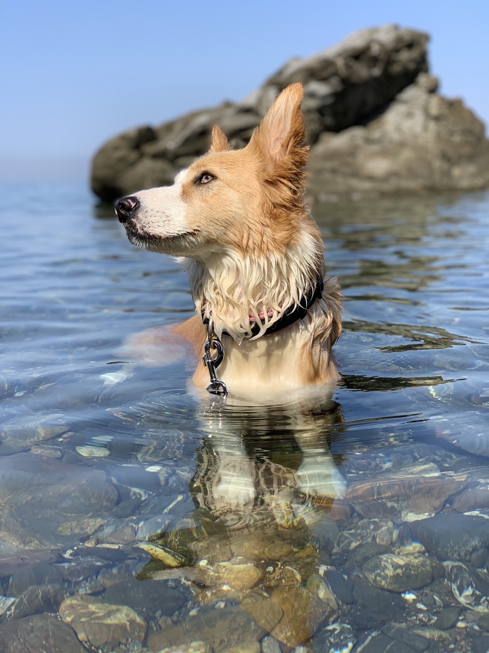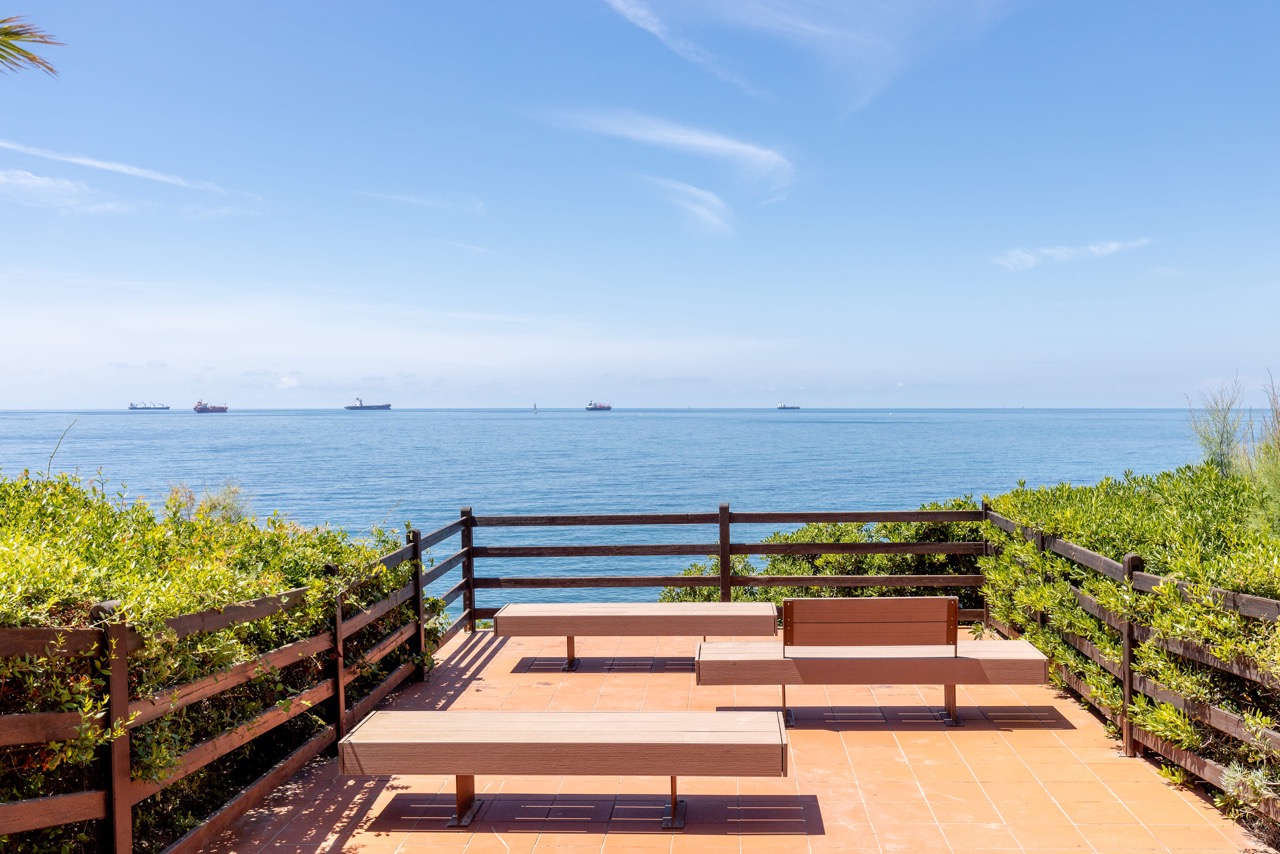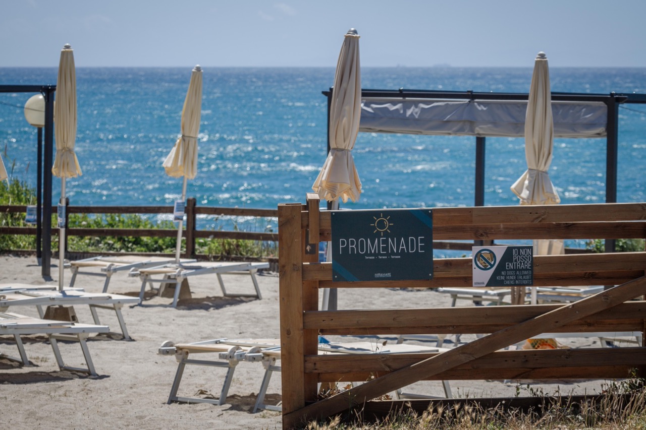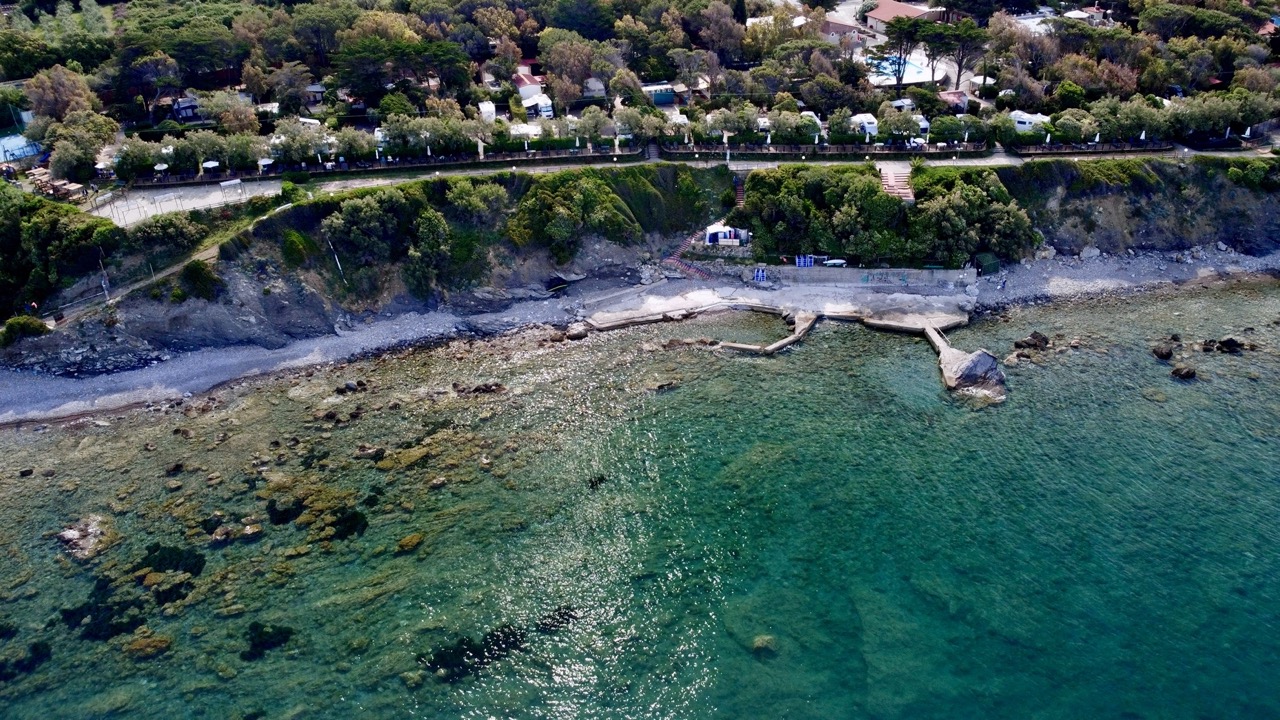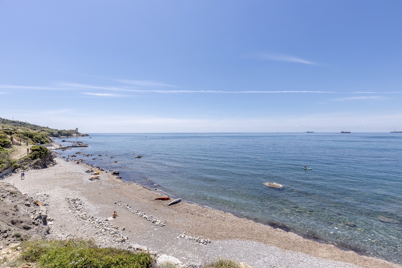 De rotsachtige kust is bereikbaar via een korte trap. Het strand is vrij toegankelijk; je kunt je eigen parasol meenemen of er een huren, samen met kano’s of SUP’s. De twee panoramische terrassen ("Promenade" en "Cavalleggeri") bieden ligstoelen en schaduwrijke plekken net boven zee – één is huisdiervriendelijk.